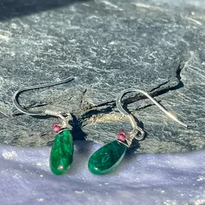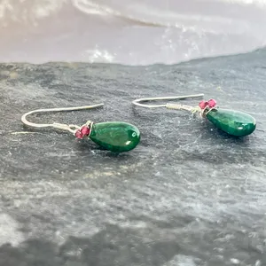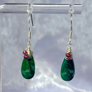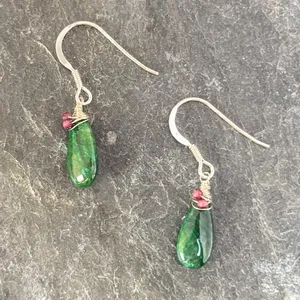 Handmade Emerald and Garnet Sterling Silver Drop Earrings.