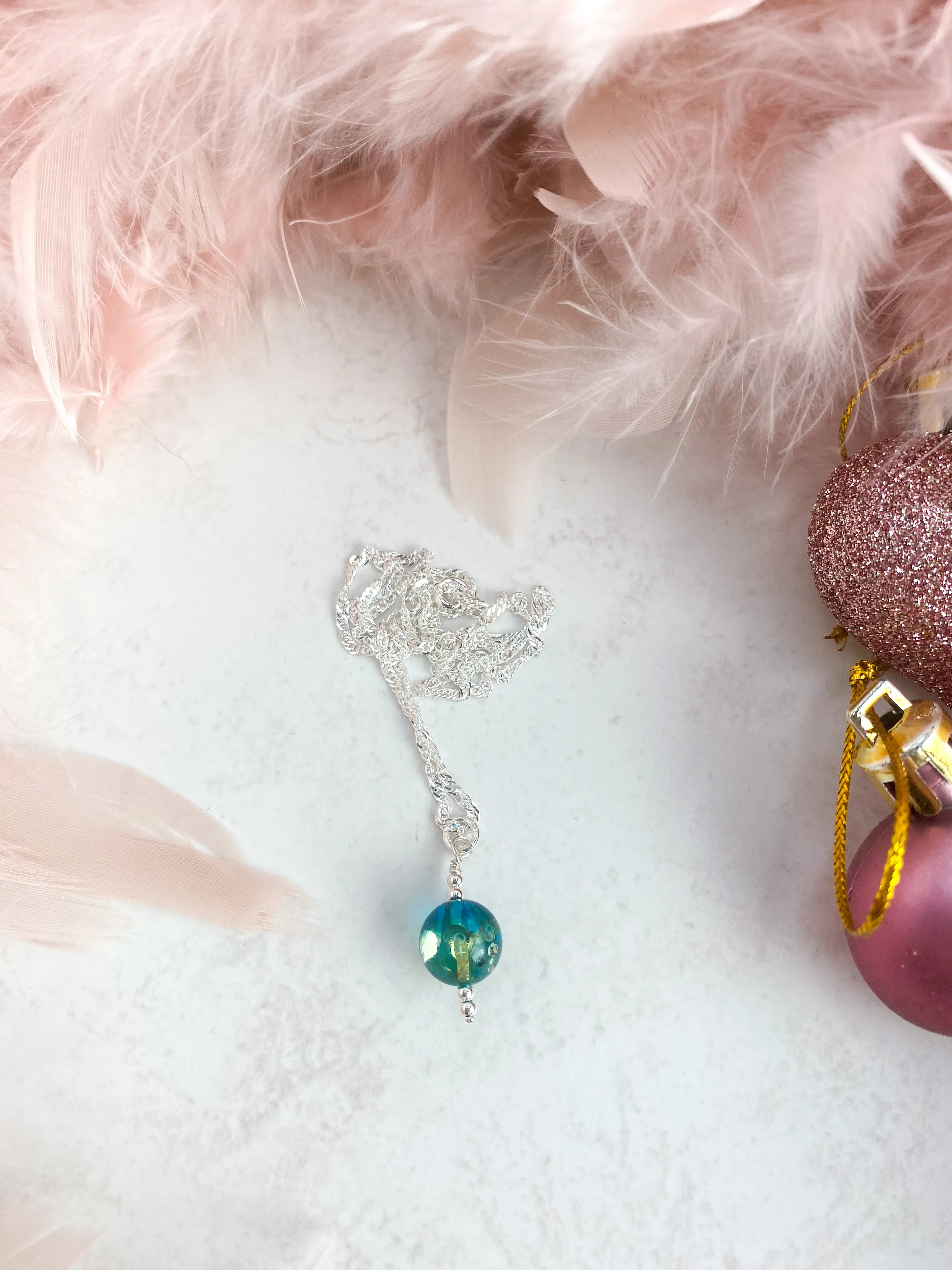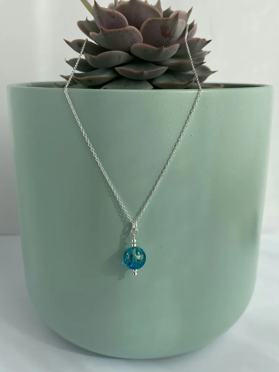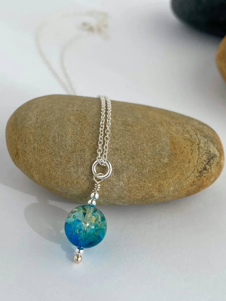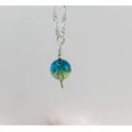 This piece is a large 10mm in size, framed by sterling silver accent beads and suspended from an 18in sterling silver chain.